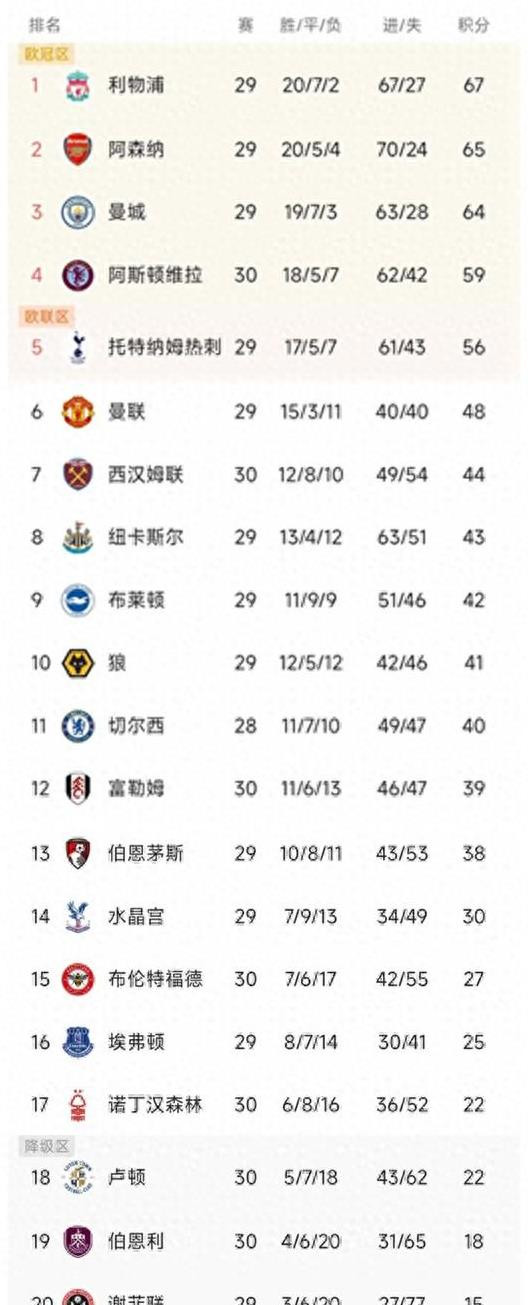 英超最新积分榜: 利物浦第1, 枪手第2, 蓝月亮第3, 红魔第6