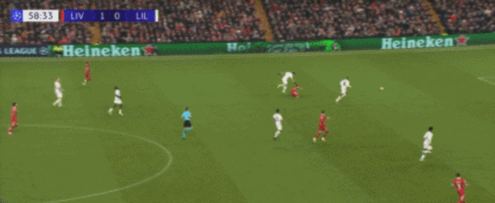 第59分钟,利物浦直塞打穿防线,里尔后卫曼迪绊倒了迪亚斯,两黄变一红被罚下场,里尔十人作战。