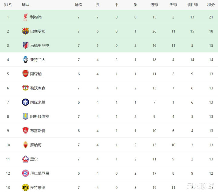 以上是最新的积分榜,除了利物浦领跑之外,巴萨、马竞、亚特兰大分列第二至第四。
